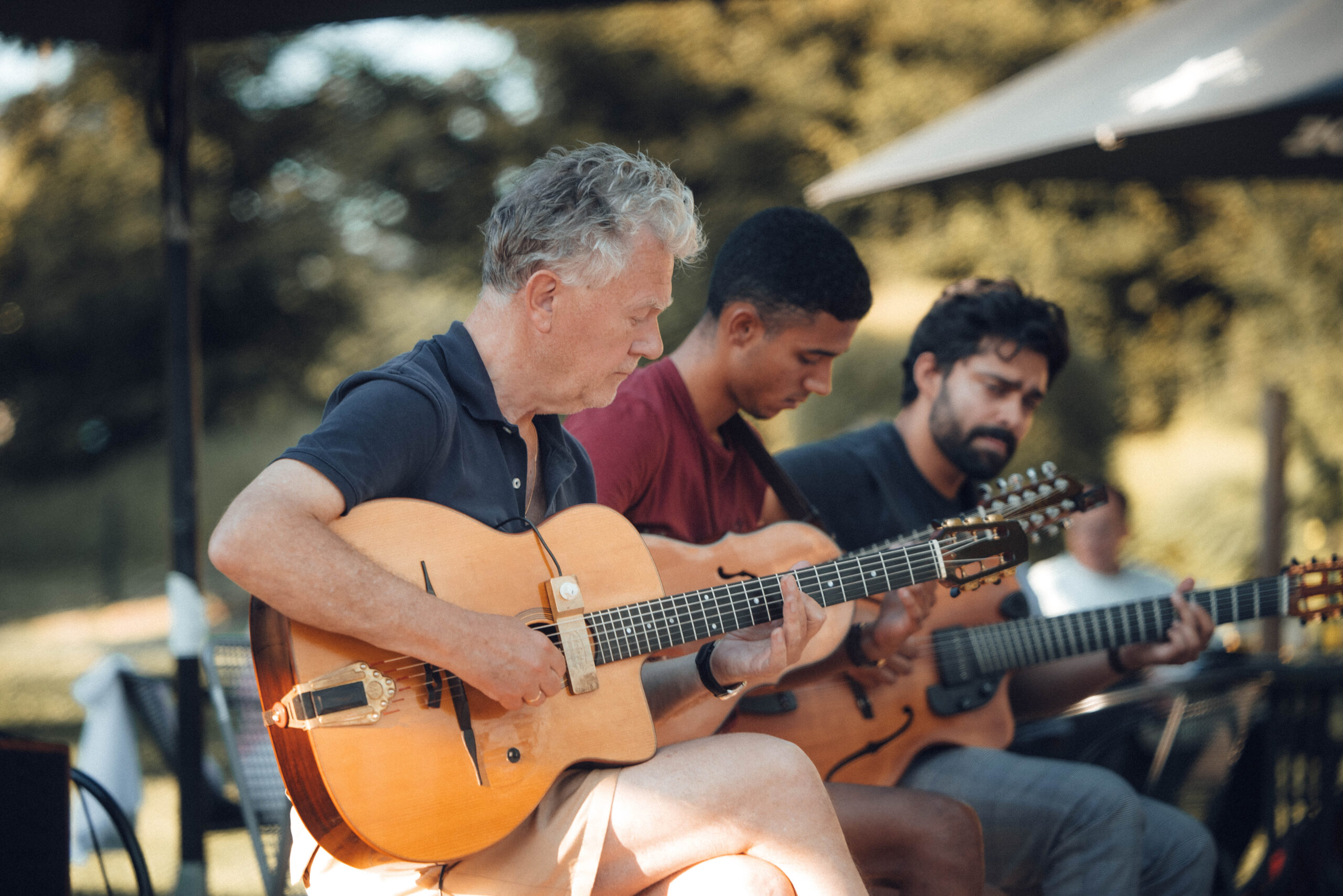 Django Vagabonds ist ein einzigartiges Trio in Europa, das durch drei von Herkunft und Alter her sehr unterschiedliche Musiker geprägt ist: dem jungen puertorikanischen Ausnahmemusiker Lemuel E. Lyando Flusa mit seinem besonderen Instrument, der Cuatro, dem „vielsaitigen“ Tobias Santosh Großmann mit indisch-badischen Wurzeln an der 7-string Jazzgitarre; und der Senior des Trios und Urberliner Uli Hoffmeier, der seit fast 30 Jahren Mitglied des Palastorchester mit seinem Sänger Max Raabe ist. Gemeinsam ist ihnen die Liebe zur Musik Django Reinhardts, auf dessen Spuren sie durch halb Europa ziehen. Sie bringen seine Kompositionen ebenso selbstverständlich zu Gehör wie die selten gehörte traditionelle Jibara-Musik Puerto Ricos und deutsche Swingnummern der 20er und 30er Jahre.